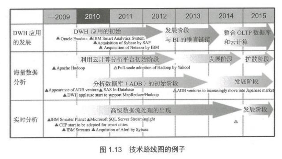 图1.13列出了一份由野村综合研究所在2010年发布的技术路线图。它主要预测了自发布时起到2015年止,数据分析的趋势及其对特定产品的影响。