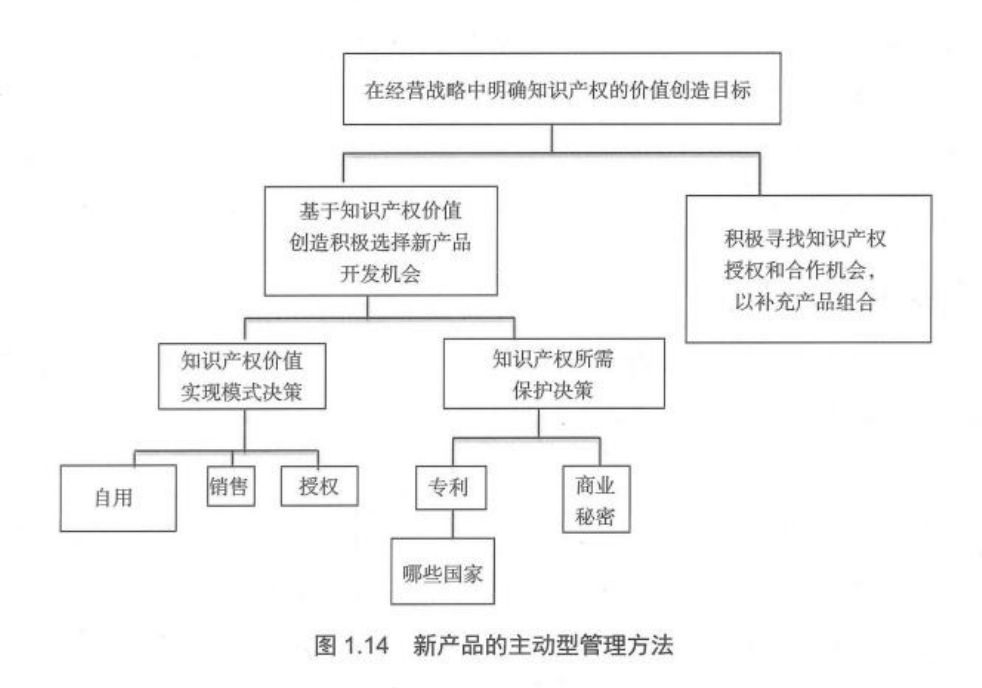 表1.1总结了知识产权管理的4种方法,即回应型、主动型、战略型、优化型。图1.14总结了新产品知识产权的主动型管理方法。
