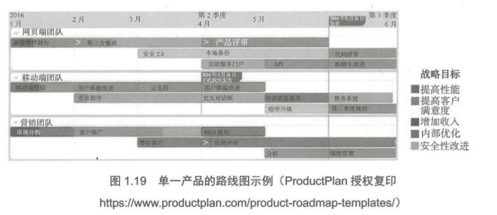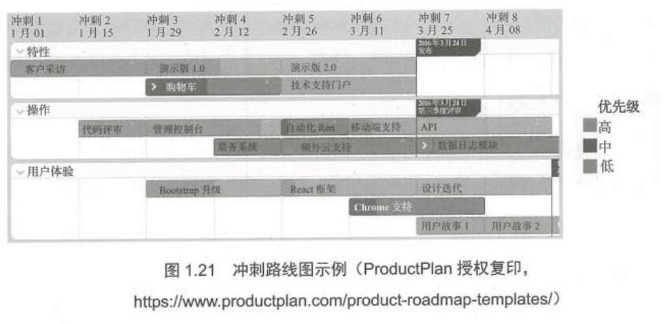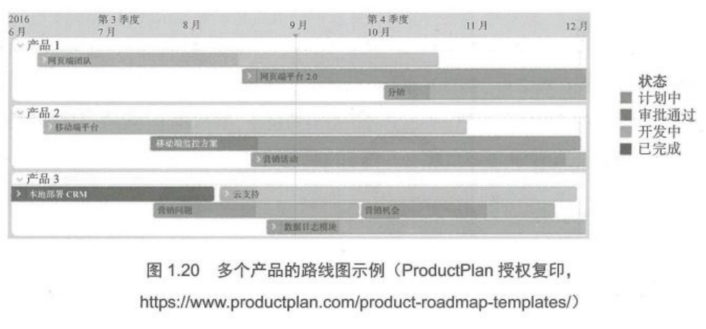 产品路线图的服务对象可以是某个单一产品(见图1.19)或是一组产品,如某一类别的产品或业务单元(见图1.20)。产品路线图还能应用于新产品敏捷开发流程中(见图1.21)。