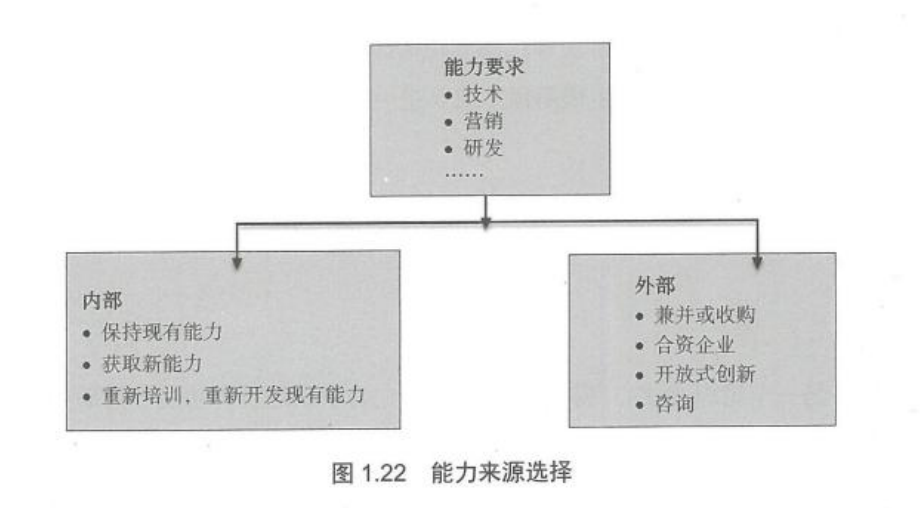 在定义了创新战略之后,当务之急是正确地建立起一组执行该战略所需的能力。建立这样一组能力的途径有很多种,如何选择出恰当的途径,将取决于与创新战略及组织的整体愿景和目标相关的一系列因素。可选的途径包括(见图1.22 ):